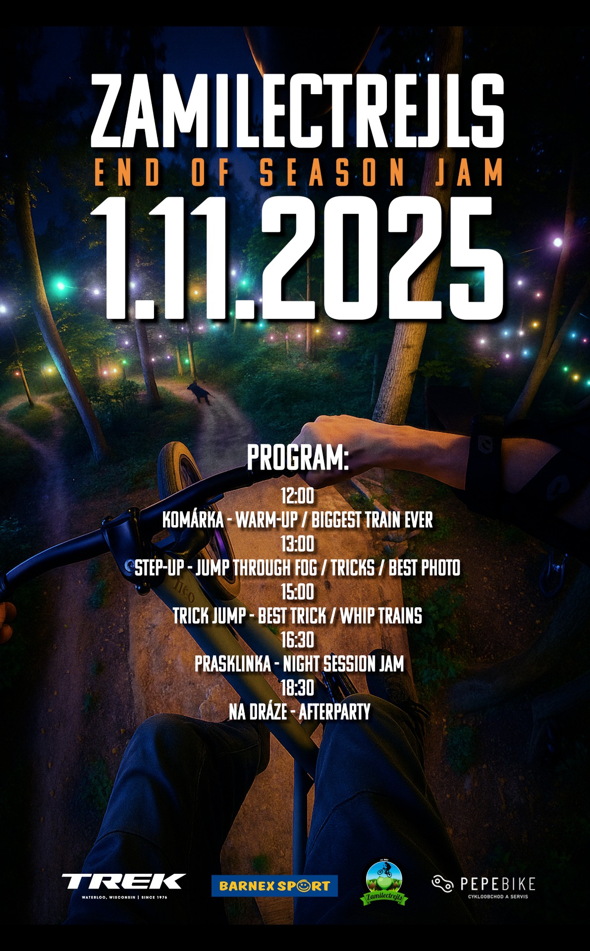 Zveme vás na speciální akci na ukončení sezóny 2025 - END OF SEASON JAM 2025! Dáme si vláček na komárce, foto session na step-upu, best trick na novém skoku za Komárkou a zakončíme to speciálně nasvícenou prasklinkou na free jam za tmy. Prostě parádní bajk den, který si nesmíte nechat ujít. 1.11. v sobotu.
